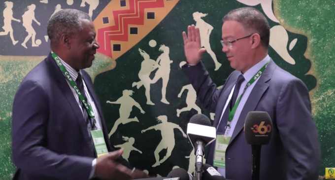 Le président du Comité de normalisation de la Fédération Camerounaise de Football (Fecafoot), Dieudonné Happi, et le président de la Fédération Royale Marocaine de Football (Frmf), Fouzi Lekjaa, ont, ce 6 mars 2017, fait une déclaration à la presse présente à Marrakech au Maroc pour le Symposium sur le football féminin en Afrique, organisé par la Confédération Africaine de Football, sous le haut patronage de sa Majesté le Roi du Maroc, Mohammed VI.