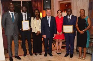 Le 28 novembre dernier à la Résidence de France, en présence notamment de M. Biendi Maganga Moussavou, Ministre de l’Agriculture et de l’Elevage, M. Philippe Autié, Ambassadeur, Haut Représentant de la République française au Gabon, a remis leurs diplômes à deux lauréats gabonais du Campus du Développement (anciennement CEFEB – Centre d’études financières, économiques et bancaires), le centre de formation de l’Agence française de Développement (AFD).