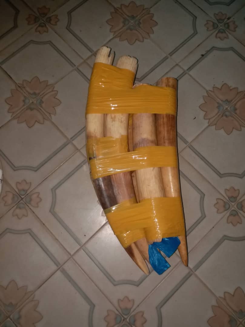 Sur le lieu indiqué comme étant celui choisi pour le déroulement de la transaction, c’est aux environs de 8h30 mn que l’équipe parviendra à mettre la main sur le suspect Norbert NDZANG, de nationalité gabonaise âgé de 51 ans. Il a été pris en flagrant délit de trafic d’ivoire dans l’une des chambres d’un hôtel de la ville. Le présumé trafiquant a été pris en pleine commercialisation d’un important lot de 6 pointes d’ivoire, dont 2 sectionnées en 4 morceaux, scotchées et soigneusement dissimulées dans un sac de voyage rouge.