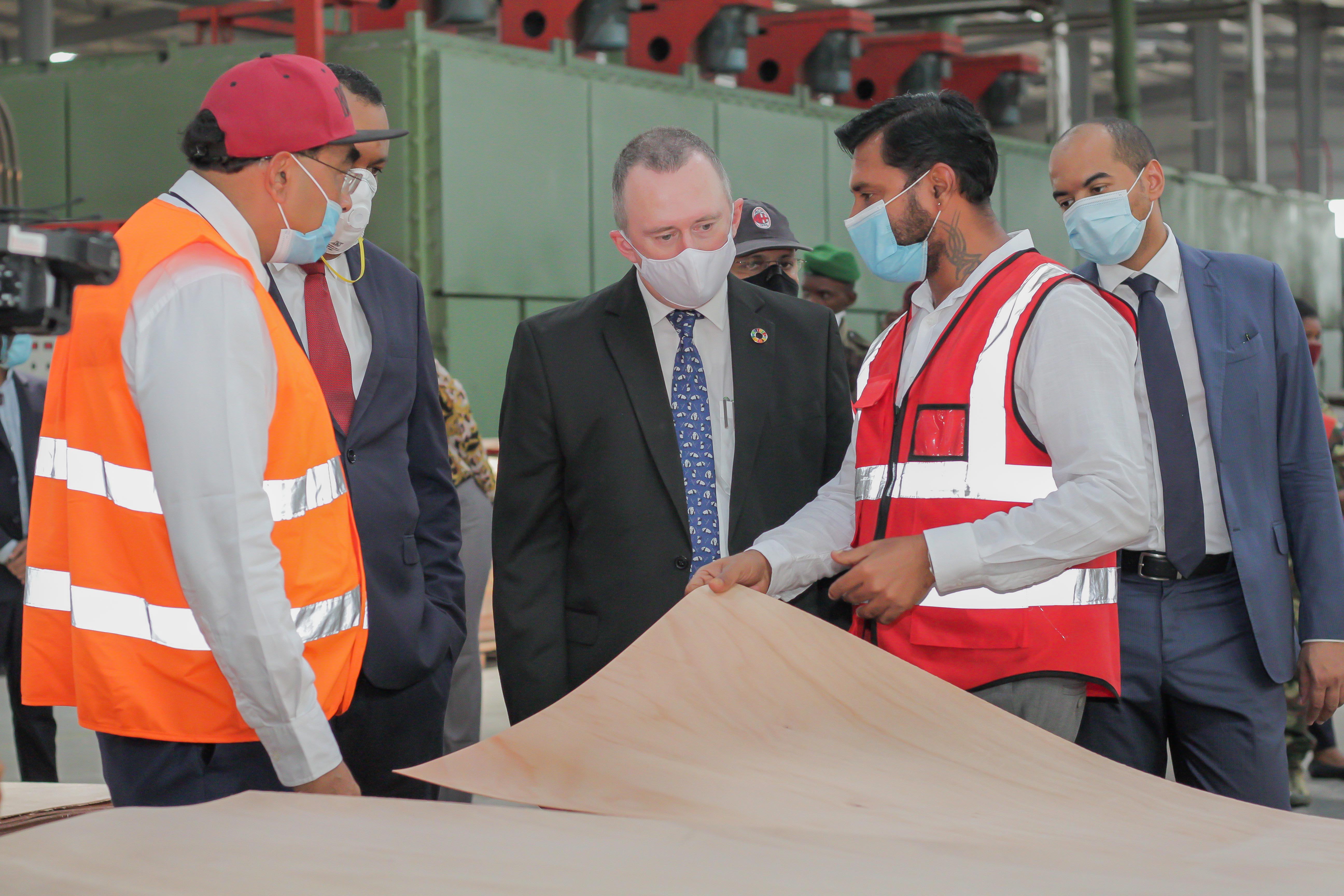Le ministre des Eaux, des Forêts, de la Mer, de l’Environnement, chargé du Plan climat, des Objectifs de développement durable et du Plan d’affectation des Terres, Prof. Lee White, accompagné de son ministre délégué, M. Oswald Séverin Mayounou, et du directeur général des industries, du commerce, du bois et de la valorisation des produits forestiers, M. Auguste Ndouna Ango, a visité ce jour les unités de transformation du bois Greenply, Wood Tech, Cluter, et Starply Gabon situées dans la Zone économique spéciale de Nkok.