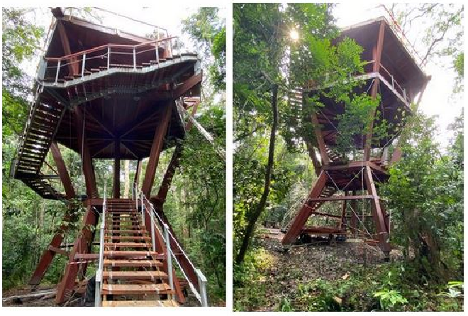 Cette infrastructure de 14 mètres de haut, logée au cœur du Bois des Géants de l’Arborétum Raponda Walker, est entièrement réalisée en bois du Gabon (padouk). Elle répond à un double objectif : d’une part une approche pédagogique au bénéfice des jeunes générations qui viendront en visite avec leur établissement scolaire, d’autre part une sensibilisation environnementale à destination du grand public qui souhaiterait découvrir les richesses naturelles du pays. Le bâtiment abrite une plateforme de 100 m² carré qui proposera aux visiteurs des contenus informatifs et pédagogiques sur la faune et la flore en forêt tropicale.