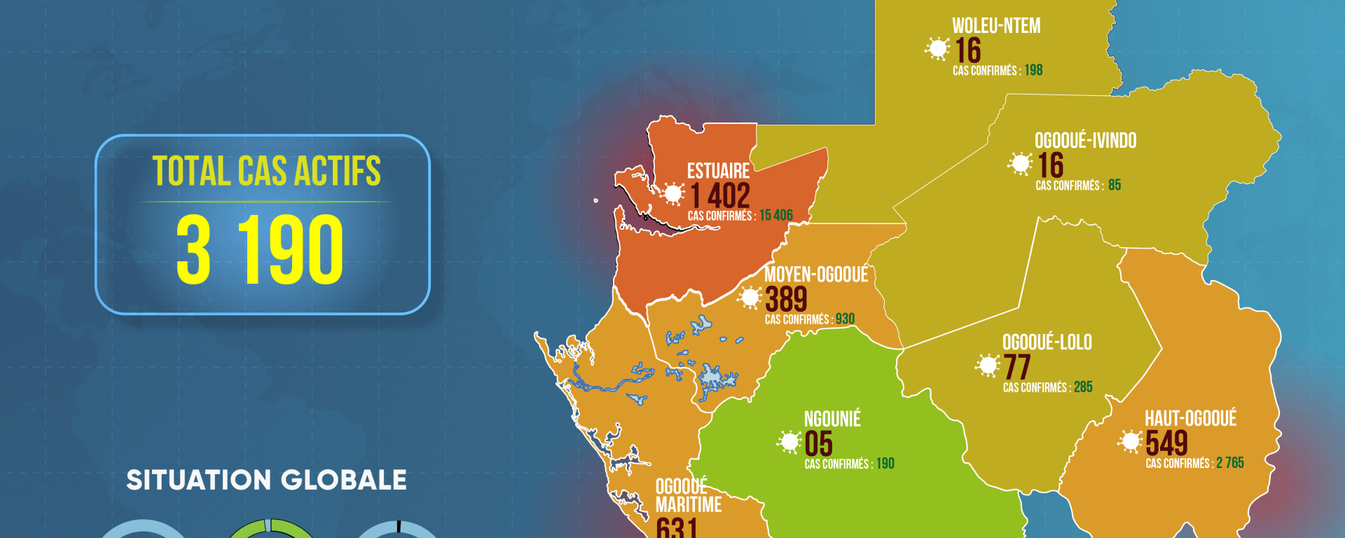 – Woleu Ntem : 03 nouveaux cas positifs sur 24 prélèvements dont 02 à Bitam et 01 à Oyem, soit un total de 198 cas confirmés.