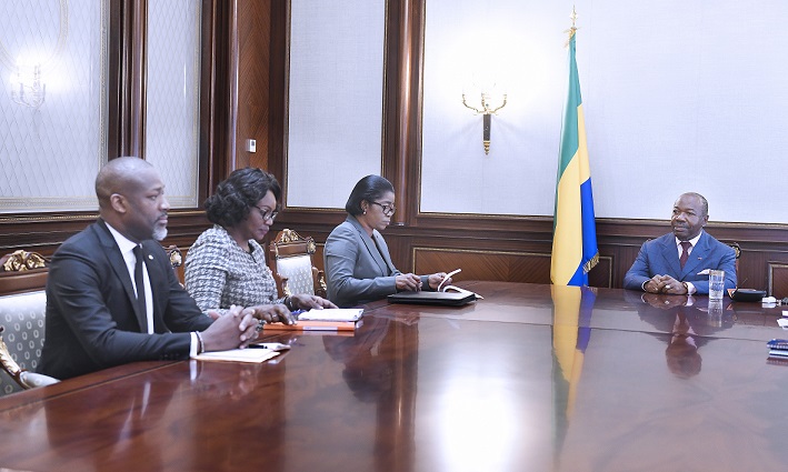 Le Président de la République, Ali Bongo Ondimba, s’est entretenu le 18 mai dernier au Palais Rénovation avec le Premier ministre, Rose Christiane Ossouka Raponda qu’accompagnaient madame Edith Ekiri Mounombi épouse Oyouomi, ministre du Budget et des comptes publics et Monsieur Yann Koubdje, Directeur général de la Comptabilité publique et du Trésor.