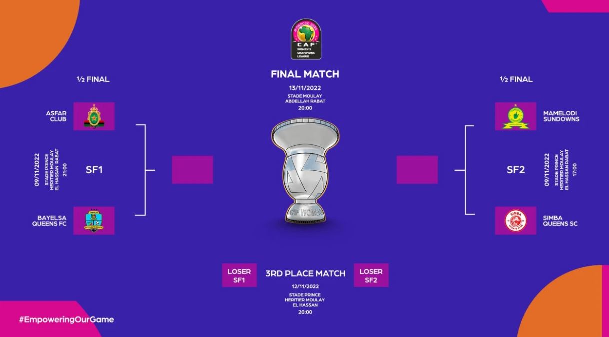 Pour les demi-finales, Mamelodi Sundowns d’Afrique du Sud affrontera le Simba Queens FC de Tanzanie à 17h00 heure locale (16h00 GMT) tandis que l’ASFAR du Maroc affrontera le Bayelsa Queens FC du Nigéria à 21h00 heure locale (20h00). 00 GMT).