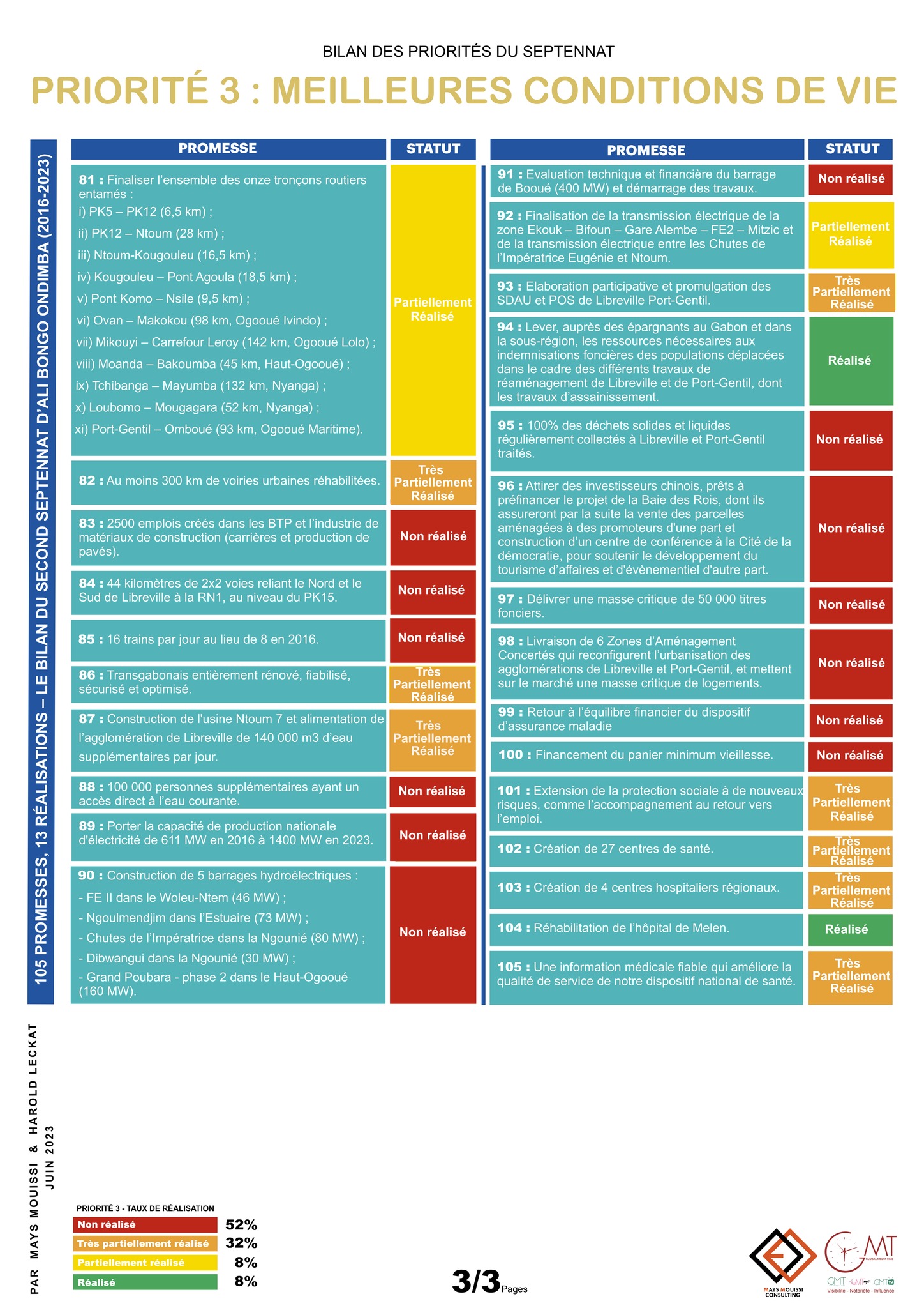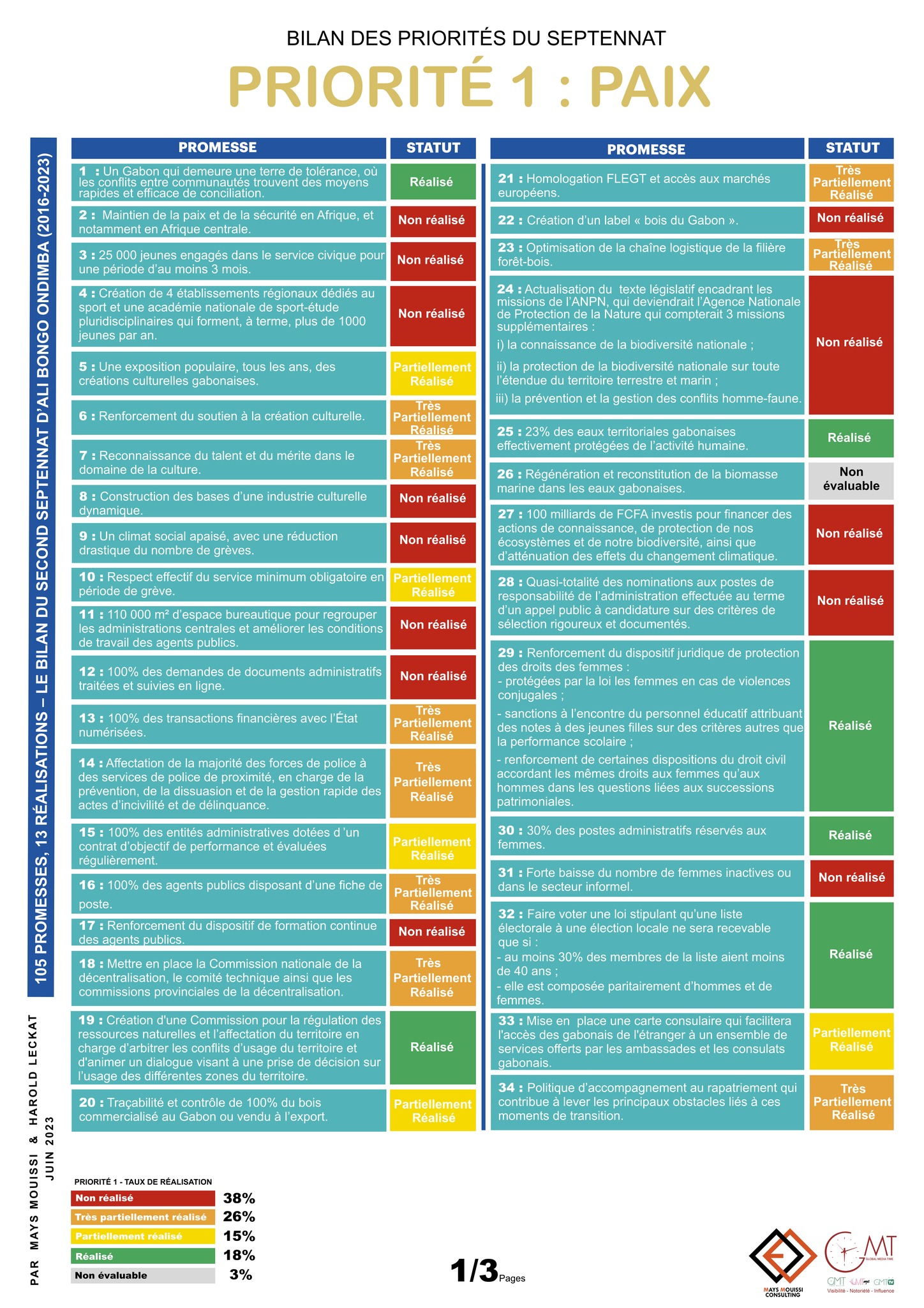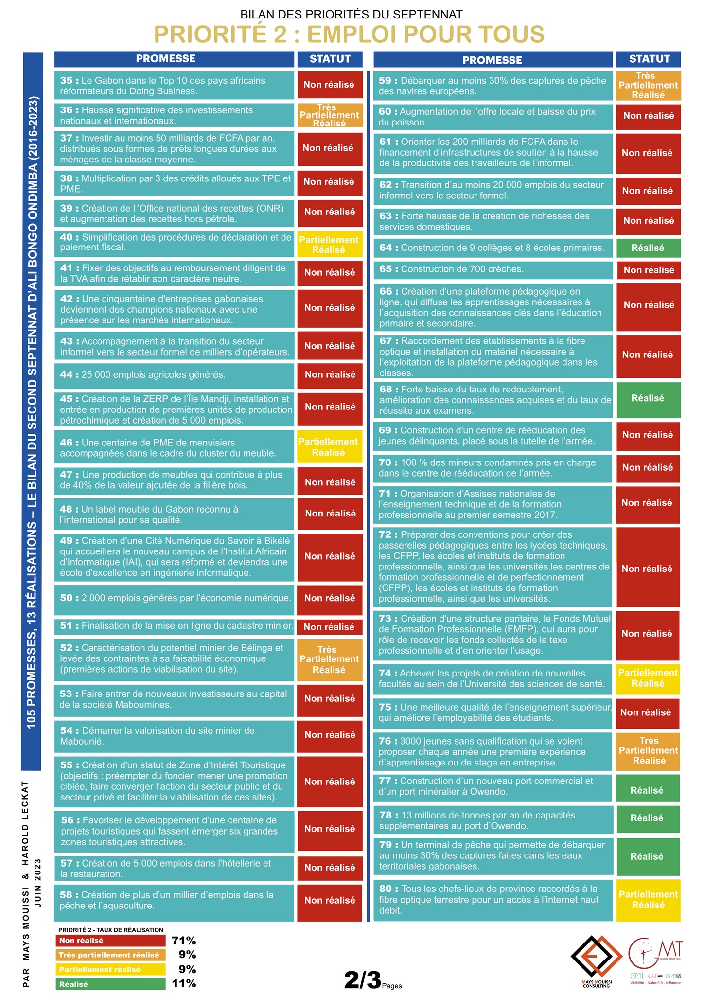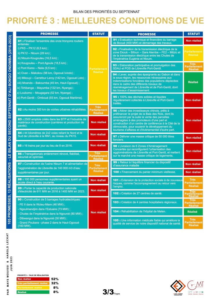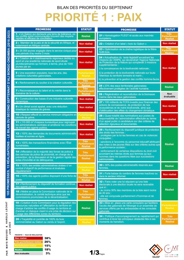 Le Rapport « 105 promesses, 13 réalisations – Le bilan du second septennat d’Ali Bongo Ondimba (2016-2023) » réalisé par le cabinet de conseil indépendant spécialisé dans la réalisation d’études socio-économiques Mays Mouissi Consulting et l’agence de communication Global Media Time, est désormais disponible.