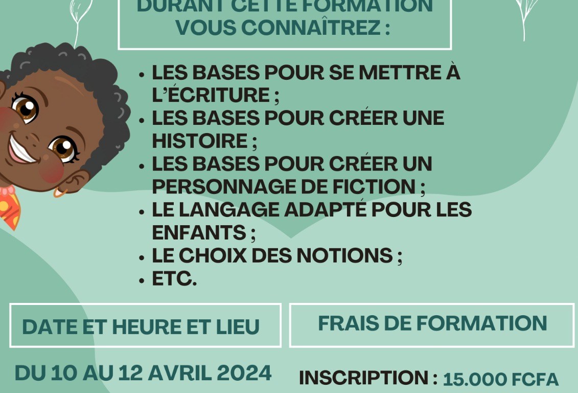 Pour en connaitre davantage, l’Association pour la Promotion du Livre et des Arts (APLA) organise en marge du 1er Salon du Livre de Jeunesse de Libreville (qui aura lieu du 9 au 13 avril 2024) une formation à l’écriture des livres de jeunesse du 10 au 12 avril 2024 de 9 heures à 16 heures au Palais des Sports et de la Culture de Libreville. Les frais d’inscription sont à 15 000 francs CFA et la formation coute 115 000 francs CFA. Les participants auront la possibilité d’y connaitre les bases pour se mettre à l’écriture, les bases pour créer une histoire, les bases pour créer un personnage de fiction, le langage adapté pour les enfants, le choix des notions.