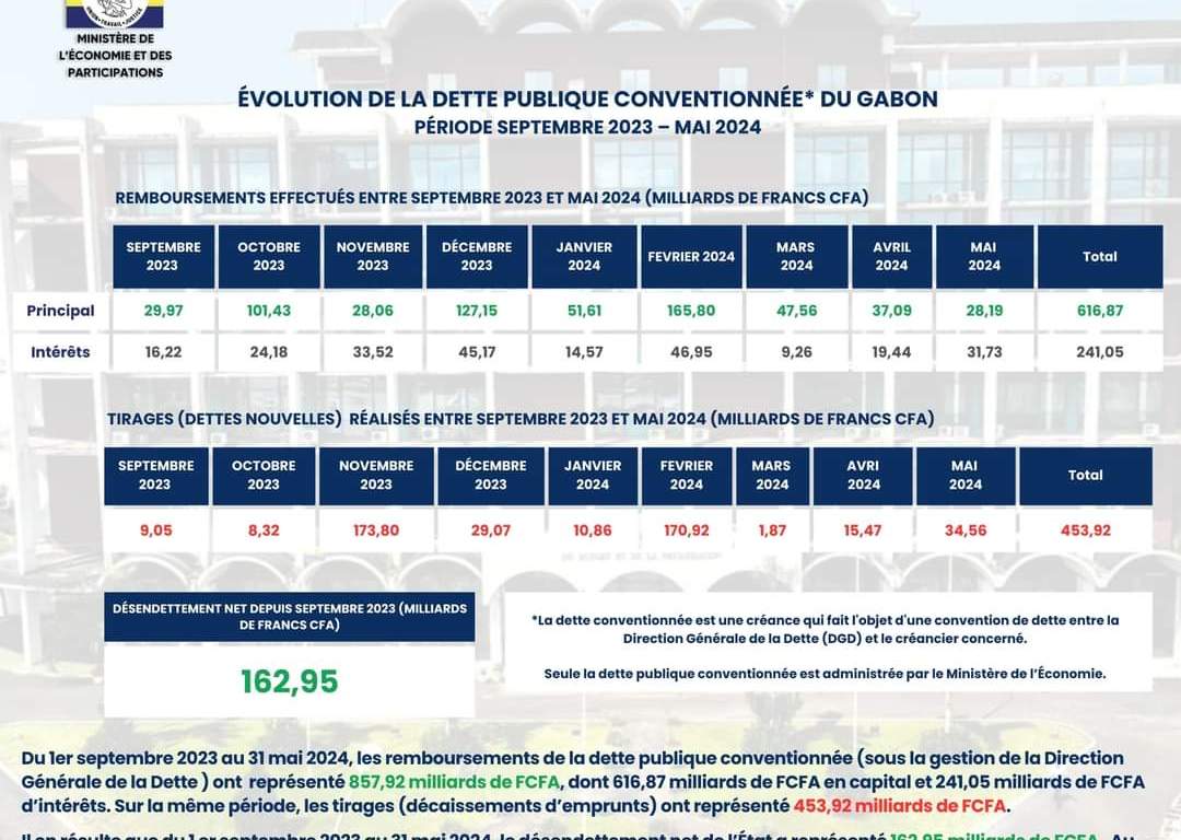 Avec pour Chef d’orchestre le Président de la Transition, Général de Brigade, Brice Clotaire OLIGUI NGUEMA, et conformément aux orientations budgétaires approuvées par le Parlement lors de l’adoption de la loi des Finances, le Gabon a réalisé des remboursements significatifs de sa dette publique conventionnée sur la période allant du 1ᵉʳ septembre 2023 au 31 mai 2024.