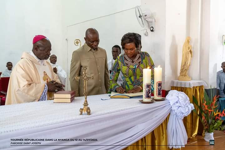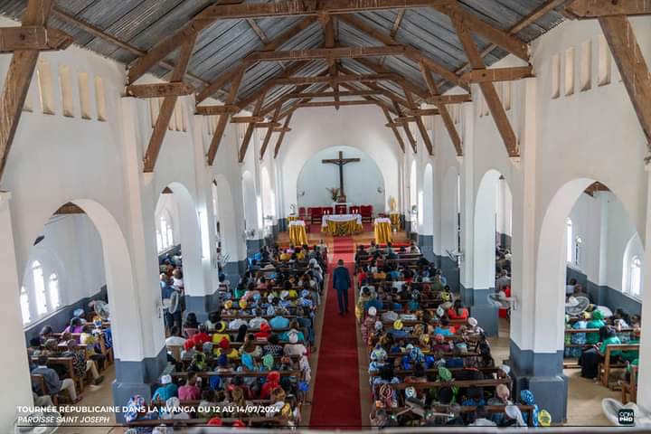 Le dimanche 14 juillet 2024, le Chef de l’État Brice Clotaire Oligui Nguema et son épouse Zita Oligui Nguema ont pris part au culte du 15ᵉ dimanche du temps ordinaire à l’église Saint Joseph de Tchibanga. Ce moment spirituel a été l’occasion pour le couple présidentiel de rendre grâce à Dieu pour leur séjour dans cette localité.