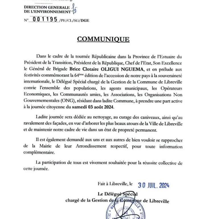 Dans le cadre de la tournée Républicaine dans la Province de l’Estuaire du Président de la Transition, le Général de Brigade Brice Clotaire Oligui Nguema, et en prélude aux festivités commémorant la 64ème édition de l’accession de notre pays à la souveraineté internationale, le Délégué Spécial chargé de la gestion de la Commune de Libreville convie l’ensemble des populations, les agents municipaux, les Opérations Économiques, les communautés amies, les Associations, les Organisations Non Gouvernementales (ONG), résidants dans ladite Commune, à prendre une part active à la Journée Citoyenne du samedi 3 août 2024.