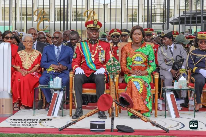Le couple présidentiel a activement pris part à la commémoration du premier anniversaire du Coup de la Libération, le 30 août 2024, à l’esplanade de la mosquée Hassan II à Libreville. Cet événement de grande envergure a attiré une foule nombreuse, témoignant de l’importance de cette journée pour la Nation.