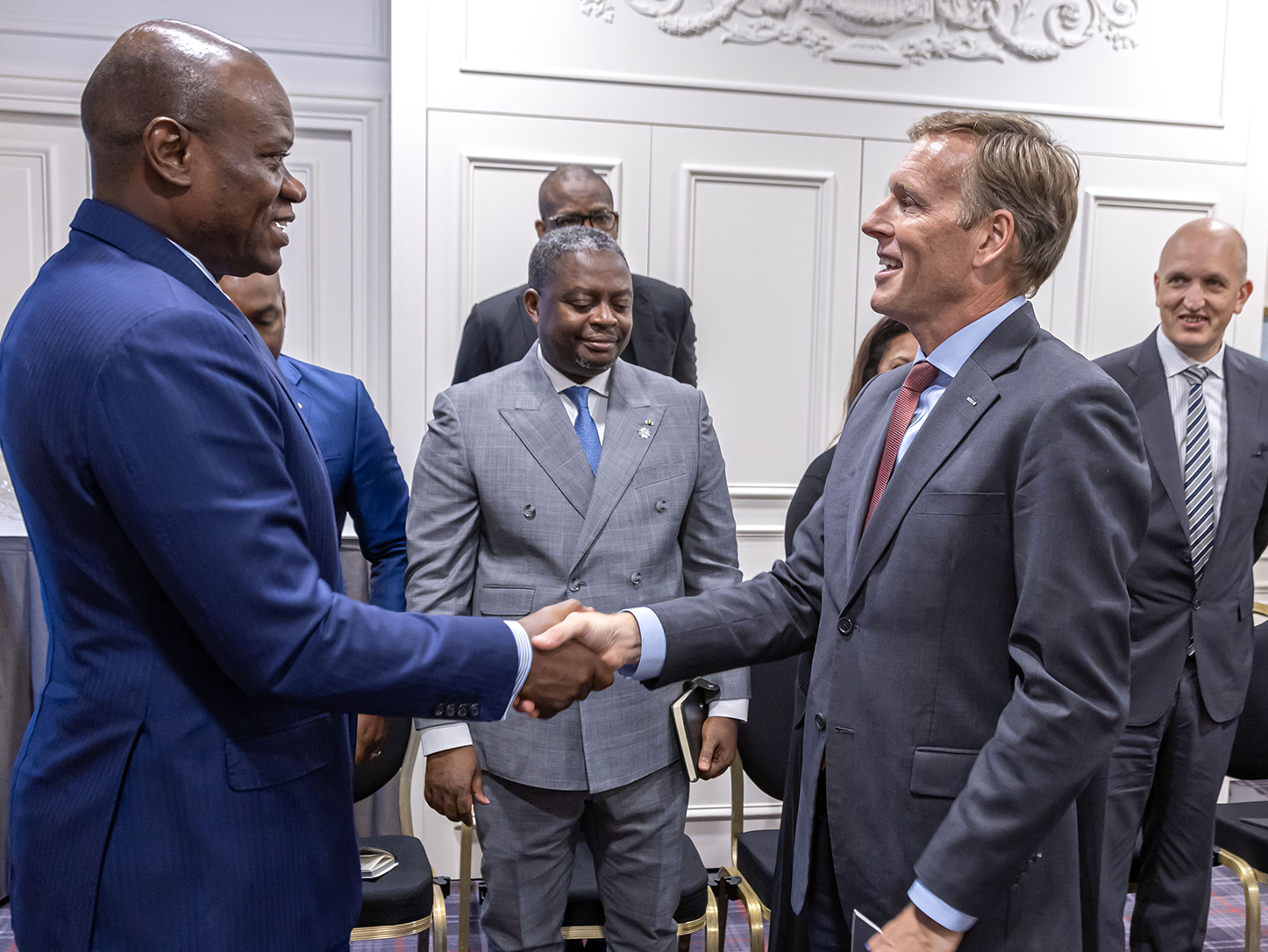 En marge de sa participation au 19e Sommet de la Francophonie, le Président de la Transition, le Général Brice Clotaire Oligui Nguema s’est entretenu ce jour avec monsieur Wouter Van Wersch, Directeur Exécutif de la compagnie Airbus qu’accompagnaient messieurs Nyl Moret Mba et Marc Gaffajoli, respectivement Directeur général de Fly Gabon et Directeur de la compagnie Afrijet.