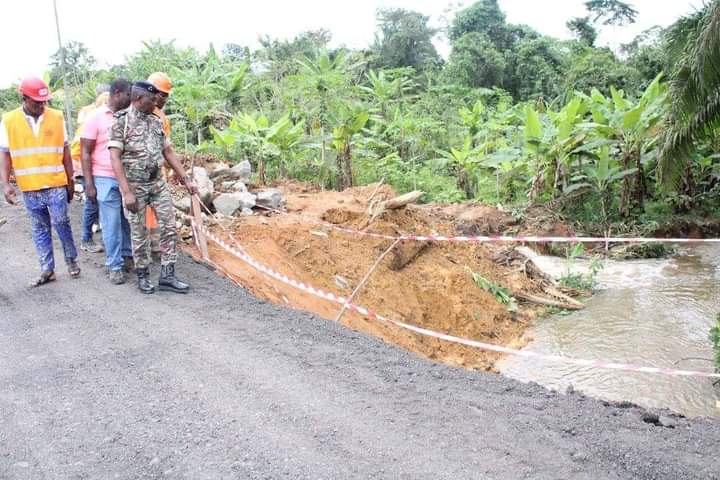 Le samedi 5 octobre 2024, le Ministre des Travaux Publics, le Général de Division Flavien Nzengui Nzoundou s’est rendu au village d’Ayémé-Bokoué, sur la Nationale 1, pour évaluer la coupure de la route survenue la veille. Cette interruption est due aux fortes pluies tombées pendant trois jours, qui ont provoqué une retenue d’eau et emporté les ouvrages d’art provisoires installés au niveau de la déviation.