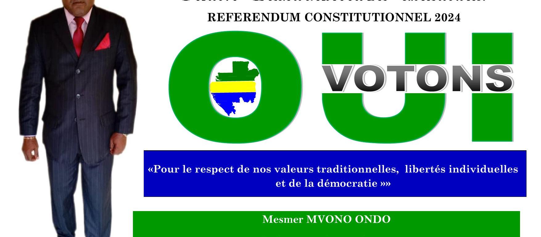 Dans le cadre de la campagne référendaire relative au Référendum Constitutionnel du 16 novembre prochain, le Président-Fondateur du Front Démocratique Gabonais (FDG) Mesmer Mvono Ondo a organisé une conférence de presse le 12 novembre 2024 dans les locaux de son Parti situé au quartier PK 8 dans le sixième arrondissement de la Commune de Libreville.