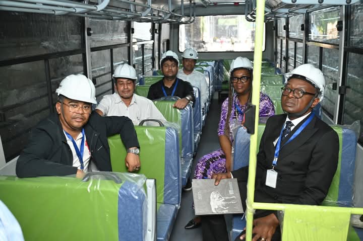 Au cours de leur visite, la délégation gabonaise a pu découvrir chaque étape du processus de fabrication des bus Tata, depuis la pose du châssis jusqu’à l’essai du jet d’eau, une démonstration impressionnante témoignant de la robustesse et de la fiabilité des véhicules.