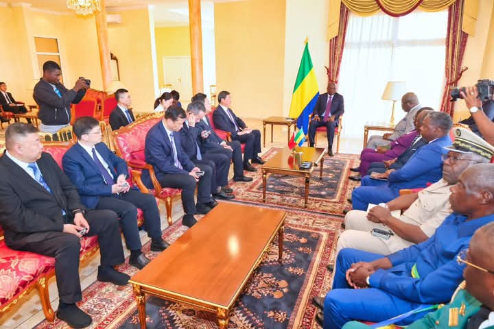 Le Président élu Brice Clotaire Oligui Nguema échange avec une délégation chinoise au Palais présidentiel d’Oyem.