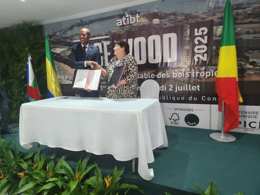 Le mardi 1er juillet, le Ministère des Eaux et Forêts, Chargé du Conflit Homme-Faune, représenté par Maurice Ntossui Allogo, a signé une convention de partenariat bipartite avec l’ATIBT, représentée par sa Présidente, Françoise Van de Ven, en marge de la conférence RACEWOOD 2025 à Pointe-Noire au Congo.