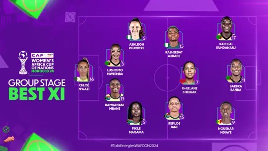 Le Groupe d’Étude Technique (TSG) a dévoilé le Meilleur Onze de la phase de groupes de la Coupe d’Afrique des Nations Féminine CAF TotalEnergies, Maroc 2024. Composé dans un schéma en 4-3-3, ce Onze Type met en lumière les talents les plus brillants de ce premier tour, à l’issue d’une phase de groupes spectaculaire marquée par 45 buts inscrits en 18 rencontres.