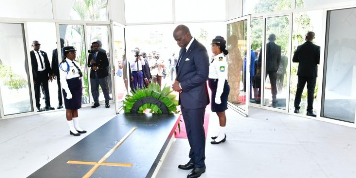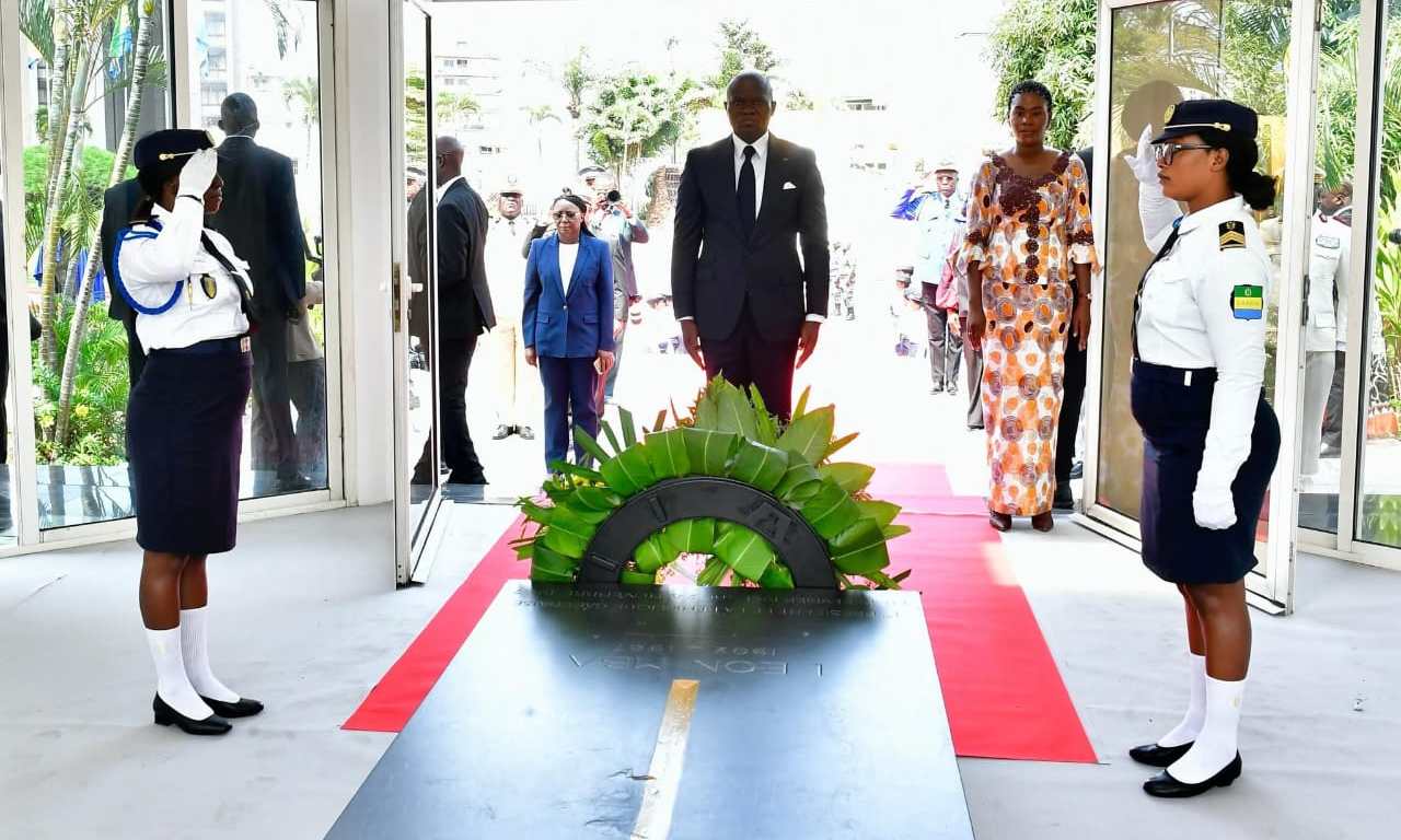 En présence des Vice-Présidents de la République et du gouvernement, des membres du Gouvernement et de la famille de l’illustre disparu, le Chef de l’État s’est recueilli et a procédé au dépôt d’une gerbe de fleurs au mausolée Léon MBA, premier Président du Gabon.