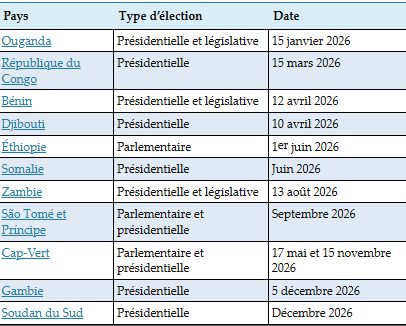 La diversité des modes de gouvernance en Afrique se reflète dans les 11 pays qui prévoient d’organiser des élections en 2026. On peut s’attendre à ce que près de la moitié d’entre elles soient compétitives, tandis que les résultats des autres sont prévisibles. Le deuxième pays le plus peuplé du continent, l’Éthiopie, ainsi que certains des plus petits, dont les nations insulaires du Cap-Vert et de São Tomé et Príncipe, se rendront aux urnes cette année.