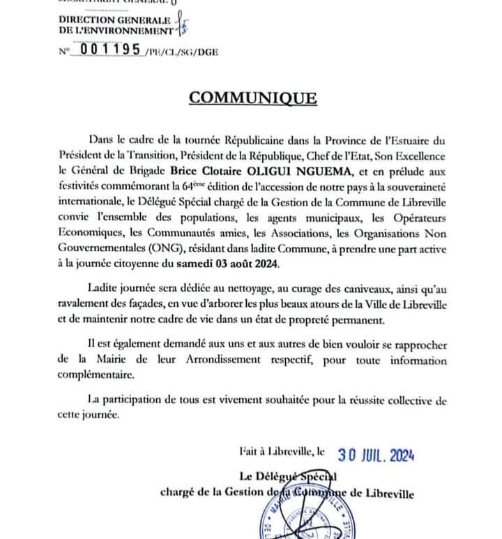 Dans le cadre de la tournée Républicaine dans la Province de l’Estuaire du Président de la Transition, le Général de Brigade Brice Clotaire Oligui Nguema, et en prélude aux festivités commémorant la 64ème édition de l’accession de notre pays à la souveraineté internationale, le Délégué Spécial chargé de la gestion de la Commune de Libreville convie l’ensemble des populations, les agents municipaux, les Opérations Économiques, … Continuer de lire Journée citoyenne du 3 août 2024 à Libreville